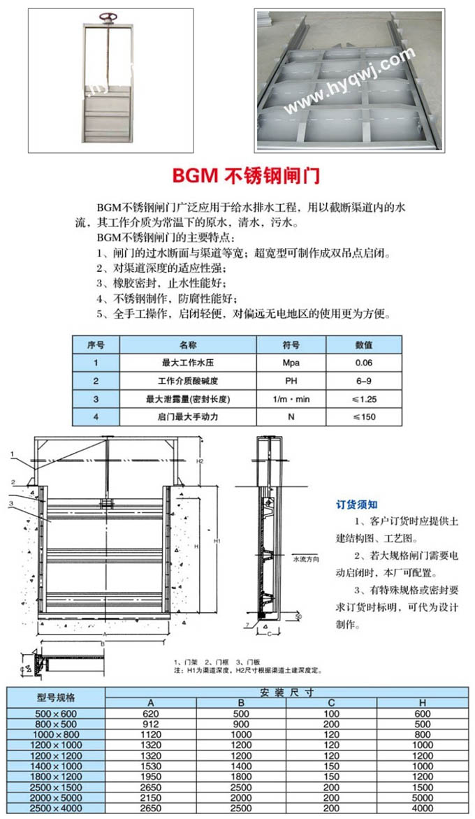 BGM不銹鋼閘門廣泛應用于給排水工程,用以截斷渠道內的水流,其工作介質為常溫下的原水、清水、污水。